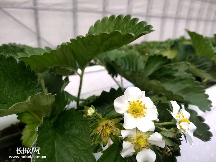 尚义县草莓种苗繁育基地冬季果棚内陆续开花挂果的草莓苗。长城新媒体记者 马宁 摄