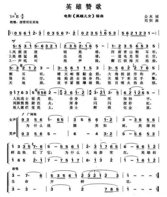 《英雄儿女》同样有一首著名的插曲,可以说唱响了几十年。这就是《英雄赞歌》,作词是《中国人民解放军进行曲》的词作者公木,作曲是刘炽。