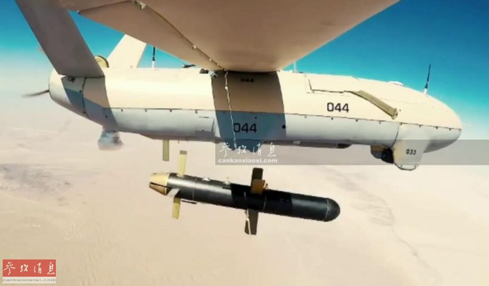 此次军演中,伊朗军方罕见集中动用了多种型号的攻击型无人机,例如图中的“见证者”(Shahed )-123小型攻击型无人机,采用略带前掠角的主翼+V形垂尾布局,能携带至少一枚Sadid-345滑翔制导炸弹。图为“见证者”-123小型无人机投弹瞬间。