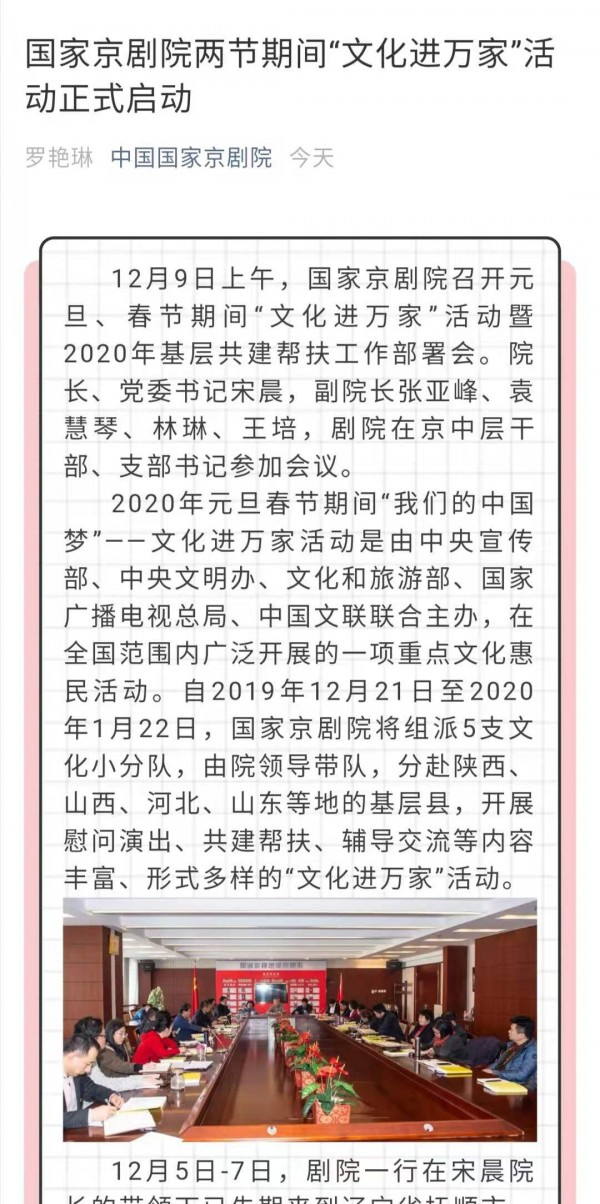 国家京剧院官方公众号12月9日发布了名为《国家京剧院两节期间“文化进万家”活动正式启动》的文章。