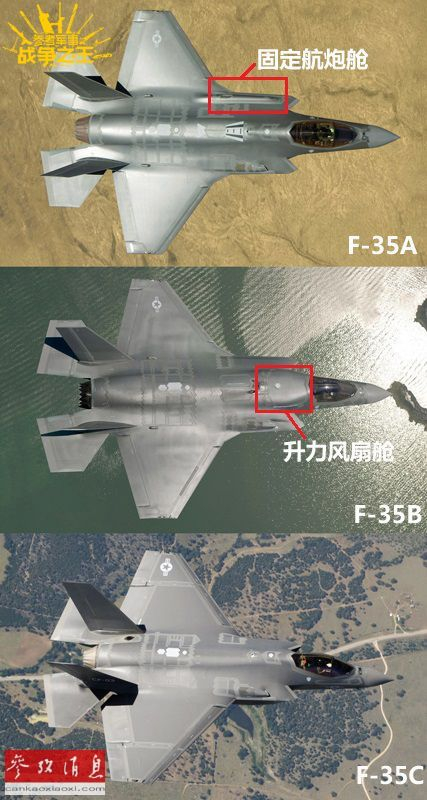 本图展示了同一俯拍角度的F-35三型号外形对比,F-35A的识别特征是固定航炮舱,F-35B则是看座舱后部的升力风扇舱,F-35C的整体尺寸(特别是翼展)均大于前两型,较为容易识别。