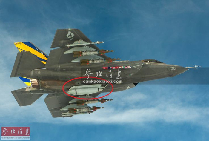 图为进行满外挂测试的F-35C战机,红圈标出的是航炮吊舱。