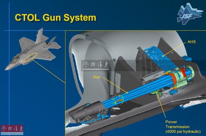F-35A(常规起降型,CTOL)配备的内置GAU-22/A固定航炮舱结构示意图。