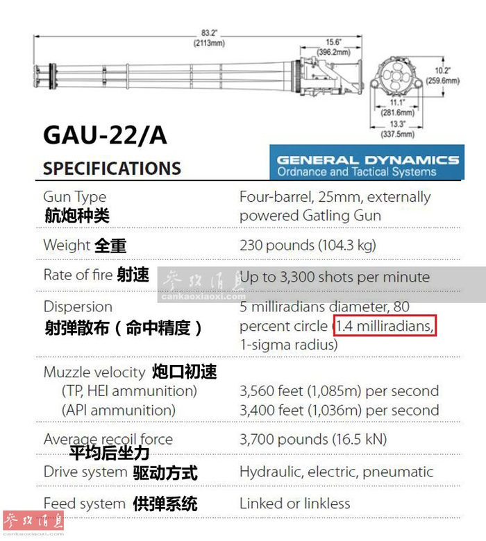 据通用动力公司公开的官方宣传册数据显示,与原版GAU-12/U相比,改进后的GAU-22/A航炮的命中精度(射弹散布)甚至能达到1.4密位。密位是常用于狙击步枪进行远距瞄准和测距用的单位。图中的红框标出了GAU-22/A的命中精度:1.4密位。