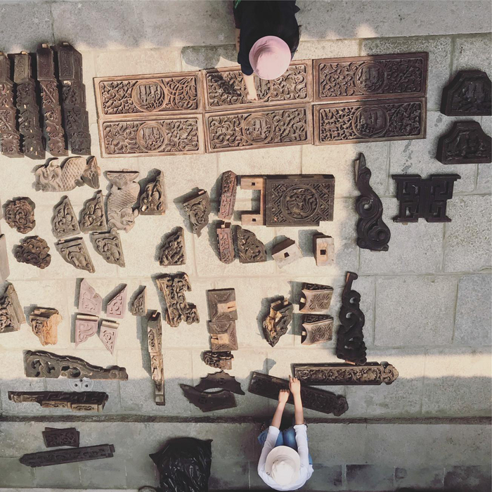 孙宅的空间改造方案得到了镇里的支持。5月底的时候,改造工程展开的同时,我们去了安放木构件的仓库,在堆叠的木构件中试图寻找出关于类型和功能的线索。太大的主梁显然并不合适在孙宅这样的民居中展出,小型的各类木构件是合适的选择。这些拼不出建筑的构件,它们脱离了最初制作的用途,却也保留了纹饰,质感以及时间的信息,成为了“古物”。我们将可以展示利用的木构件一一摊开在地,试图理解沉默的构件,重构它们与其他构件的交接关系,这种关系是空间的,也是类型学的。