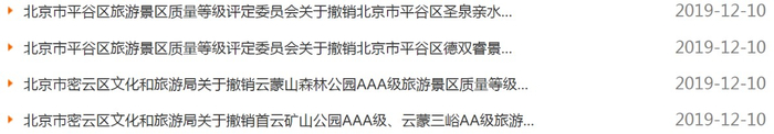 12月10日,北京日报客户端记者自北京市文化和旅游局发布的公告中获悉,北京5家景区取消A级景区资质。包括:撤销首云矿山公园AAA级、云蒙三峪AA级旅游景区等级资质,撤销云蒙山森林公园AAA级旅游景区质量等级资质,撤销北京市平谷区德双睿景区A级景区资质,撤销北京市平谷区圣泉亲水湾旅游景区A级景区资质。