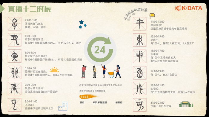从早到晚,美食类直播贯穿十二时辰,可以说吃是一天中最重要的事。从早上8点开始,美食直播的热度开始攀升;下午3点到5点是标准的下午茶时光,每100个直播美食的人,有9个在甜点店或冷饮店;晚上11点到凌晨1点,深夜食堂开始“营业”,美食出镜率Top 3是快餐、火锅和烧烤。另外,美食类直播的人均点赞数也是最多的。