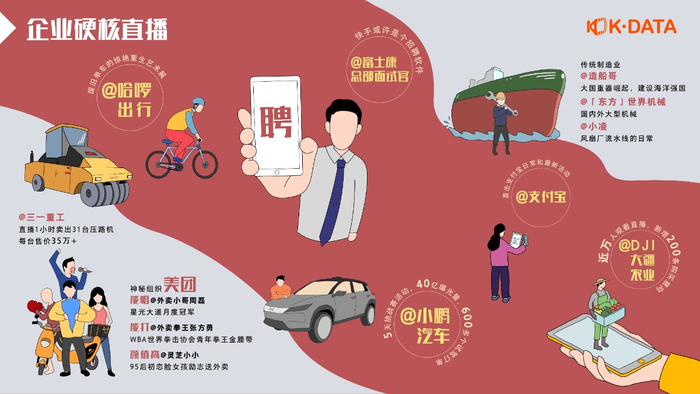 快手直播某种程度上也成为了公司的招聘渠道和企业文化墙。富士康员工用快手内推,直播园区生活,吸引多人应聘;哈啰单车直播废旧单车零件的重生艺术展,将环保与美结合到底;神秘组织美团的外卖员也已潜伏在快手多时,能唱能打颜值高。各大企业还用快手直播带货,三一重工直播1小时卖出31台压路机,每台售价超过35万;小鹏汽车直播5天获40亿曝光量、新增600多个试驾订单;大疆农业的一次直播则获得200多条购买意向。