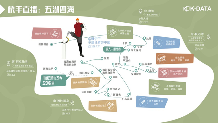 七大洲、五大洋,上至世界最高点的珠穆朗玛峰,下至地球最低点的马里亚纳海沟,远达世界尽头的南北极,都能看到快手用户的足迹。通过数据环视四方,会发现天南地北大不相同。