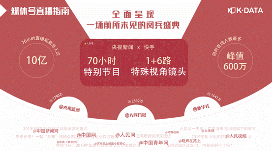 今年70周年国庆的阅兵仪式上,快手和央视新闻联合推出“1+6”多链路直播间,直播70小时特别节目,观看总人数突破10亿,同时在线人数峰值达600万。此外,全国性和区域媒体也通过快手直播为受众带来全方位的资讯获取体验,民生新闻、地区特色活动全部都有。