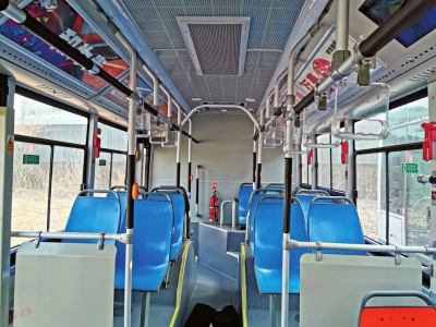山西晚报记者跟随工作人员走进车内,一排排整齐的座位博人眼球,老弱病残孕专座为醒目的橙色,其他座位为蓝色,与之前的纯电动公交车不同的是,3门车的倒数第二排座位与前排座位互为反方向,乘客在乘坐时遇到紧急刹车更安全,也更方便下车。