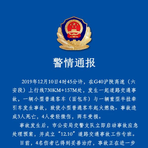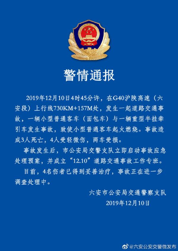 安徽省六安市公安局交通警察支队官方微博@六安公安交警微发布 12月10日发布警情通报称,当日4时45分许,在G40沪陕高速(六安段)上行线730KM+157M处,发生一起道路交通事故,一辆小型普通客车(面包车)与一辆重型半挂牵引车发生事故, 致使小型普通客车起火燃烧。 事故造成3人死亡,4人受轻微伤,两车受损。