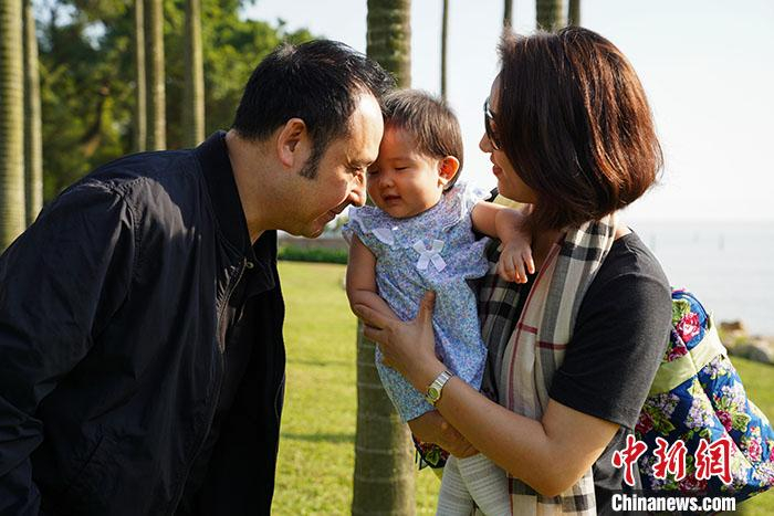 图为黄伟麟带着一家人到路环过周末时,和夫人一起看着小女儿。中新社记者 崔楠 摄