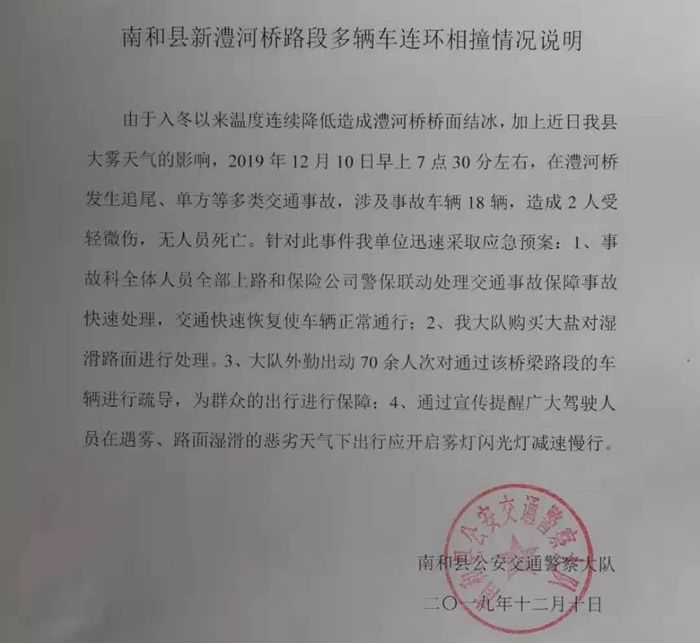 10日下午14时许,邢台南和县公安交警大队发布情况说明。通报表示,由于入冬以来温度连续降低造成澧河桥桥面结冰,加上近日大雾天气的影响,12月10日早上7点30分左右,在澧河桥发生追尾、单方等多类交通事故,涉及事故车辆18辆,造成2人受轻微伤,无人员死亡。