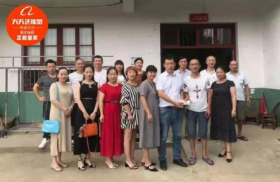 2018年6月30日,蒋忠(前排右二)确认病情后,他的同学前去看望并给他捐款。