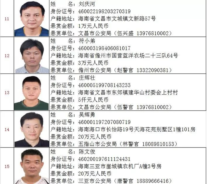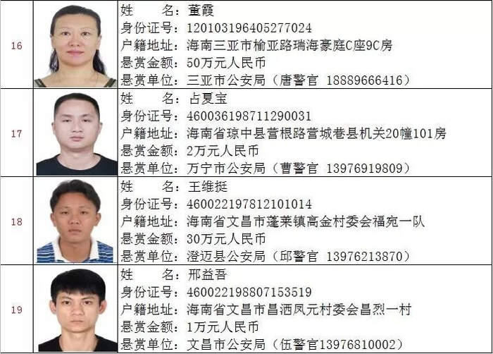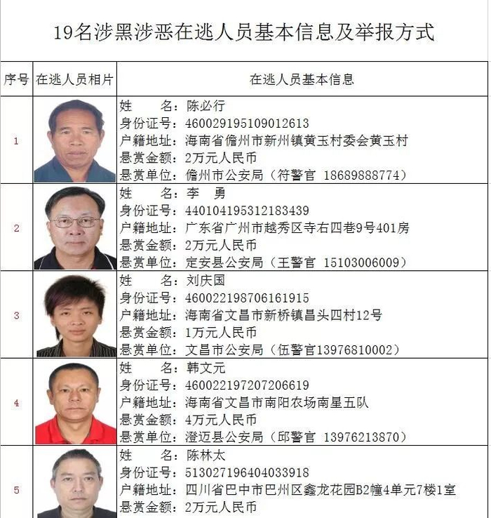 为严厉打击黑恶势力违法犯罪,坚决惩处犯罪分子,全力维护社会治安稳定,海南省公安厅决定对以下19名在逃涉黑涉恶犯罪嫌疑人予以公开悬赏抓捕,并敦促在逃人员主动投案自首,争取宽大处理。