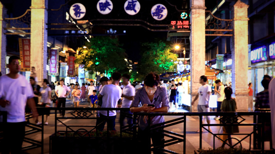 在横店著名的“网红一条街”万盛街,张金鹏靠在栏杆上看手机。郑重/摄
