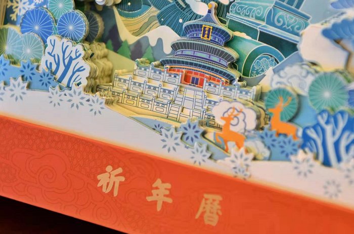 《祈年历》的设计也用了一番心思。记者看到,每一张二十四节气撕下来之后,沿着虚线撕掉顶部的日期,就成为一张单独的节气卡,集齐24张,还能收藏属于自己的天坛四时。而每一张祈年历对折就是一个书签,还可以使用背面当作便签记录生活,既文化又环保。