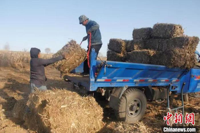 当地农民正在将打捆后的秸秆装车。 王维宁 摄