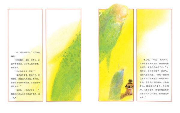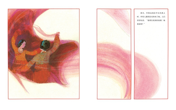 这些在今年引进出版的《叶限》一书里表现得非常典型,这本书被誉为“中国版灰姑娘的故事”,故事取材于中国古代的民间故事,画面采用中国古代的屏风式设计,而创作的媒材却是西式的粉彩。