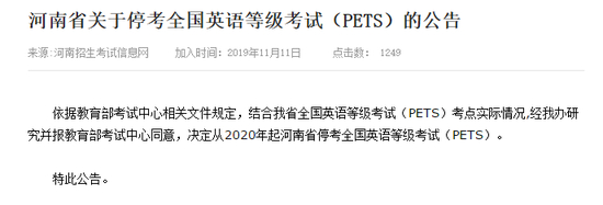 一个月前,河南省也发布停考全国英语等级考试的公告。