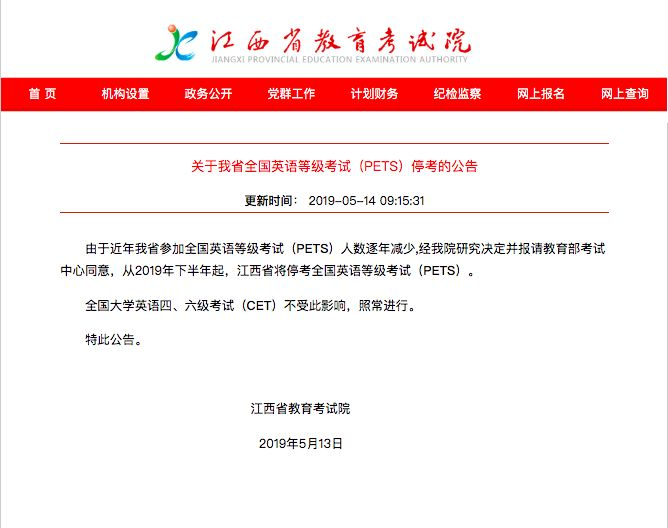 今年5月,江西省教育考试院也发公告称,江西省全国英语等级考试(PETS)停考,由于近年江西省参加全国英语等级考试(PETS)人数逐年减少。