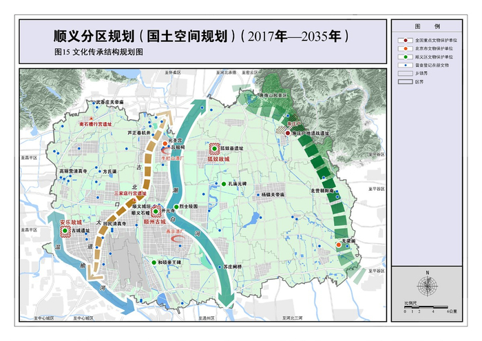 以潮白河为保护主线,以顺义八景为基础,打造题名文化景观体系,结合滨河森林公园建设,做好文化景观和历史文化展示,打造潮白河滨水主题体闲长廊。以潮白河蓝线为重点管控区城,保护好现存河道及历史遗存,重成保护历史遗存苏庄闸桥,恢复沿线重要河道历史渡口。结合北运河通航计划,研究潮白河通航的可行性。