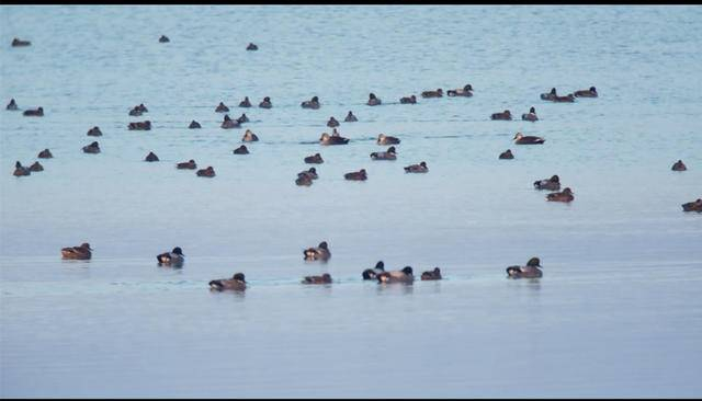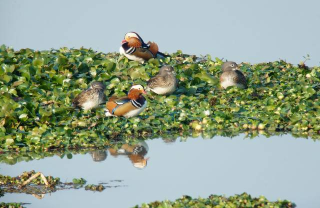 12月10日,摄影师范明在赤山湖的环河拍摄到到了这群鸳鸯。这群鸳鸯时而结伴在环河游荡,时而立于水草上梳理羽毛。其中,羽冠华丽的是雄鸟,色彩暗淡的是雌鸟。范明介绍,这群鸳鸯中的雌鸟数目,略多于雄鸟。