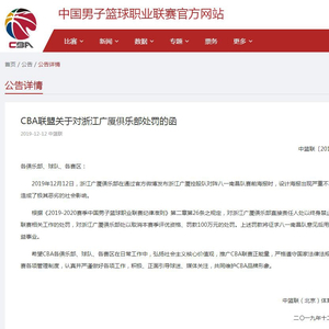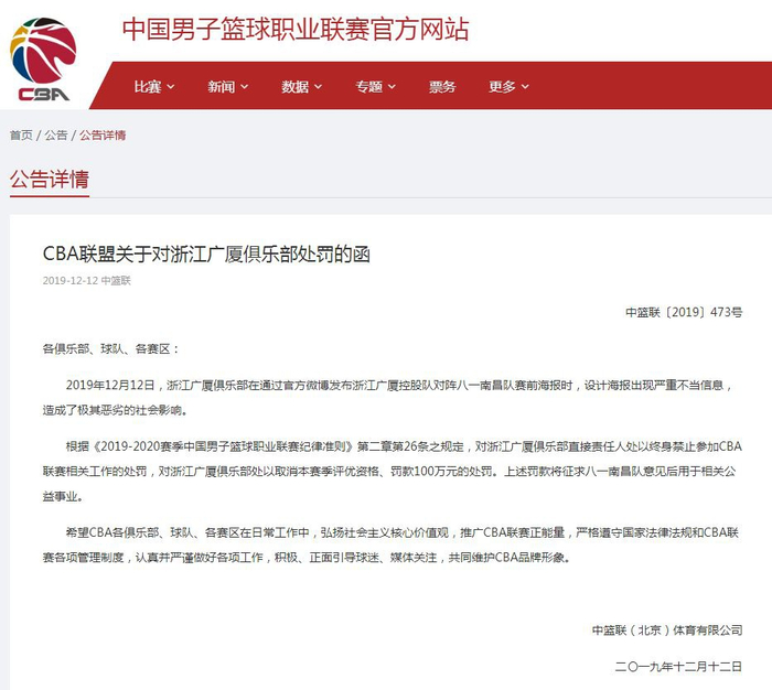中国男子篮球职业联赛(CBA)官方网站12月12日发布公告,称12月12日,浙江广厦俱乐部在通过官方微博发布浙江广厦控股队对阵八一南昌队赛前海报时,设计海报出现严重不当信息,造成了极其恶劣的社会影响。CBA联盟对浙江广厦俱乐部直接责任人处以终身禁止参加CBA联赛相关工作的处罚,对浙江广厦俱乐部处以取消本赛季评优资格、罚款100万元的处罚。