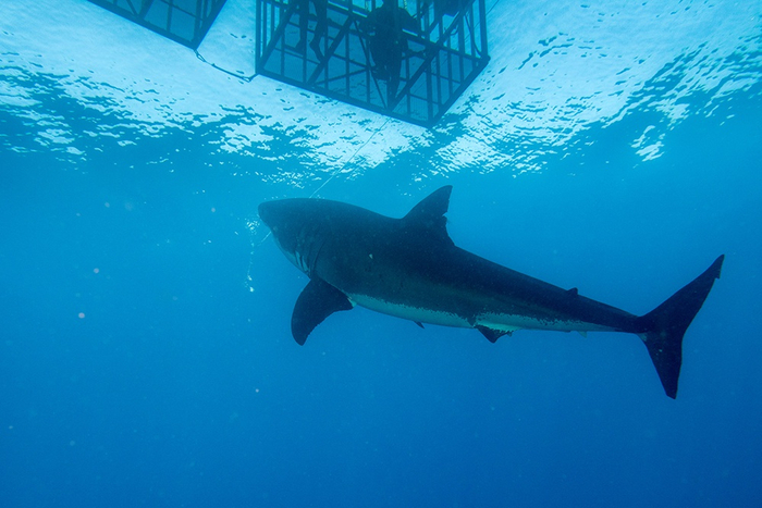 在墨西哥下加利福尼亚州的瓜达卢佩岛(Guadalupe Island)上,“鲨鱼笼潜水(Shark Cage Diving)”是当地一项非常具有人气的观光活动。而所谓“鲨鱼笼潜水”就是,游客穿上潜水服后,在工作人员的带领下,钻进绑在潜水艇下的一个铁笼子里,在水中近距离观察鲨鱼的一种活动。笼子的作用就是防止凶猛的鲨鱼攻击游客。