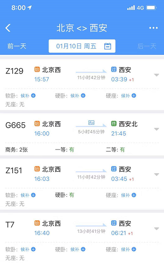 除了高铁,夕发朝至的“T”字头特快列车、“Z”字头直列车,一直都是春运时备受青睐的“高性价比”车票,当然也就更加抢手,比如北京西到西安的T7,北京西到兰州的T175、Z21等夕发朝至车次,都在第一时间被抢空!