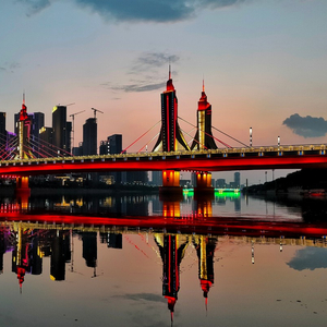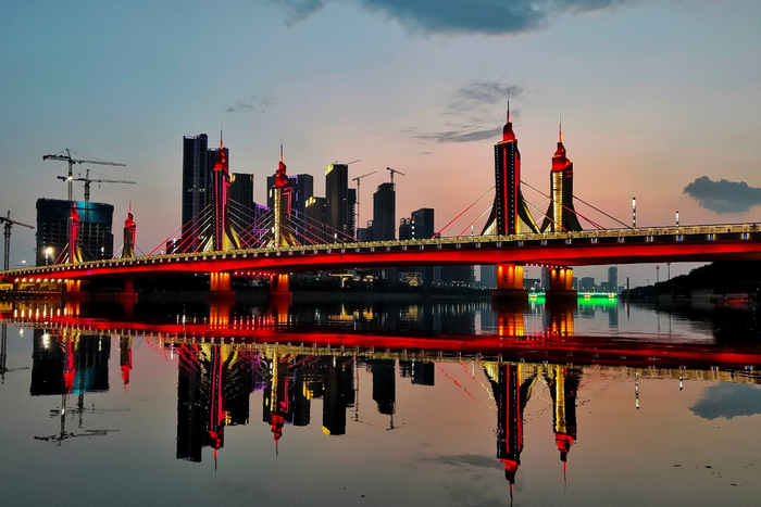通州运河大桥景观灯亮起,与落日余晖、城市建筑融成美丽图景。白继开/北晚新视觉