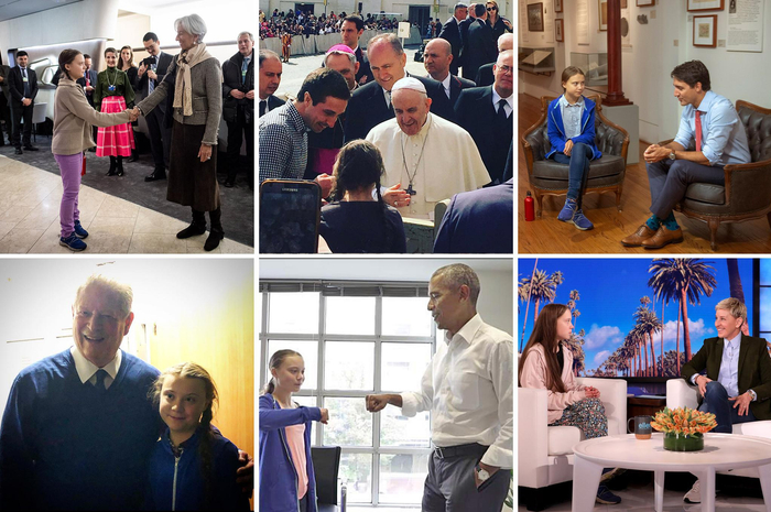 格雷塔·通贝里生于一个艺术家庭,她自8岁起关注环保议题,那是她第一次听说气候变化。2018年夏天,她从学校罢课并发起环保抗议活动。此后,她频繁出没于联合国大会、欧洲议会、达沃斯经济论坛等国际场合,受到多国元首的接见。