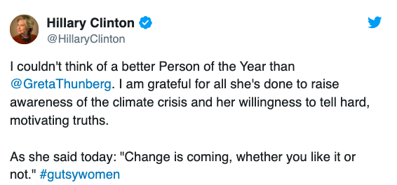日前,美国前国务卿希拉里·克林顿也在社交媒体表示认可《时代》周刊的评选结果。她说,“我想不出比格雷塔·通贝里更好的年度人物人选”。“不管你喜不喜欢,变革即将到来。”