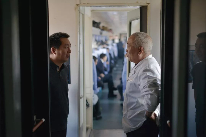 马立全和旅客在车厢连接处交流。这趟车上的旅客与列车工作人员很容易变得互相熟悉,车厢就像一个微型的公共社区。