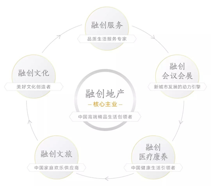 定位为中国家庭美好生活整合服务商,融创的品牌逻辑是地产+“美好生活”,所以先有了地产和服务,随着消费升级,又围绕美好生活的新内涵、新需求,向商务、旅游、娱乐、文化、健康等方向进行拓展,形成了以地产为基础,加上服务、文化、文旅、会议会展、医疗康养的六大板块全方位“美好生活”业态。