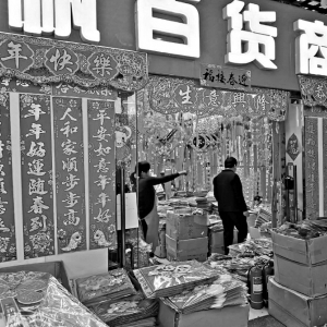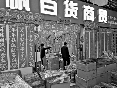 10日9时许,太原小商品批发市场附近已人头攒动、车水马龙。市场外,不少车辆排队等待进入停车场;市场内,各家店铺内红彤彤的福字对联十分抢眼,在阳光的照射下熠熠生辉,广播里循环播放着“厂家批发对联、福字、挂历、台历”的宣传语,吸引着消费者前去购买。为了让消费者更好地货比三家,市场内还专门开设了“年货百货展厅”“圣诞展厅”,从福字对联到挂历台历,从中国结到圣诞树,从红灯笼到串儿灯……各类节日饰品应有尽有,仿佛现实版的“淘宝网”。