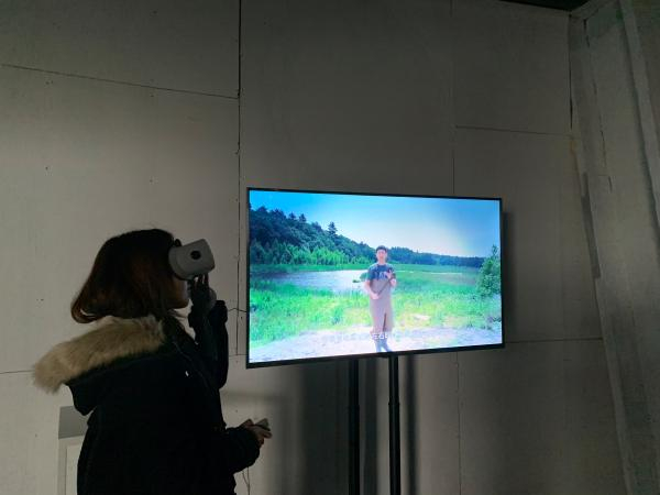 此次展览中有几件作品来自上海美术学院数字艺术系,其中一件是蒋飞的《八卦沼泽》,是这他在麻省理工学院媒体实验室工作一年期间完成的。这件作品需要用VR眼镜观看,而当观众带上眼镜的一刻,蒋飞在视频中拿着仪器探测的对应数据以图像的状态呈现。这件作品以《易经》卦象放入当下数字研究中,将八卦与多维数据、多媒体结合,将沉浸式数据放入可视化的叙事中。