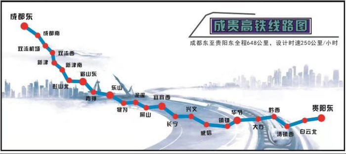 成贵高铁起于四川省成都市,途经眉山市、乐山市、宜宾市,云南省昭通市威信县、镇雄县,以及贵州省毕节市,终至贵阳市,线路全长648公里,设计时速250公里。其中,成都至乐山段已于2014年底开通运营,乐山至宜宾段2019年6月开通运营。此次开通的宜宾至贵阳段全长372公里,设宜宾西、长宁、兴文、威信、镇雄、毕节、大方、黔西、清镇西、白云北、贵阳东11座车站,初期运营时速250公里。