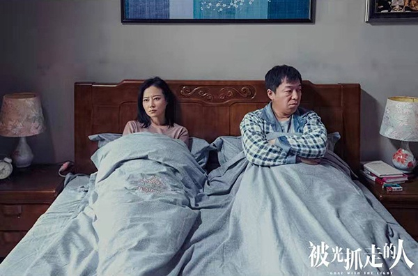《被光抓走的人》是国产片中少见的类型,包裹着“软科幻”外衣的高概念设定,让一道白光带走了世界上相爱的人,谭卓和丈夫黄渤却一起留下了。他们生活安稳平淡,作为妻子在影片开头就一边履行“夫妻义务”一边语重心长关心丈夫评职称的进度,像全然被柴米油盐淹没的样子。一起被留下,像一道审判,告诉他们,有人已经不爱了。而从否认、猜忌、生出嫌隙,甚至报复,两人没有过于激烈的大爆发,不甘与不安都藏在生活的细枝末节里。