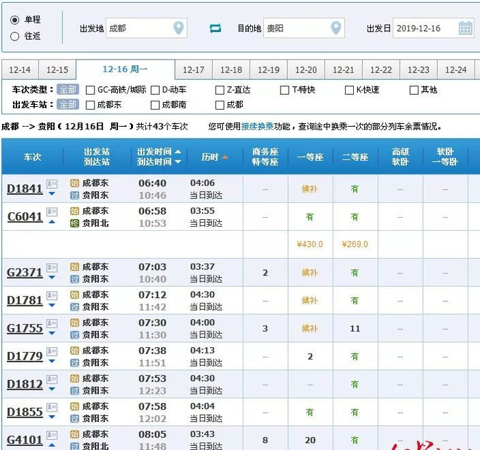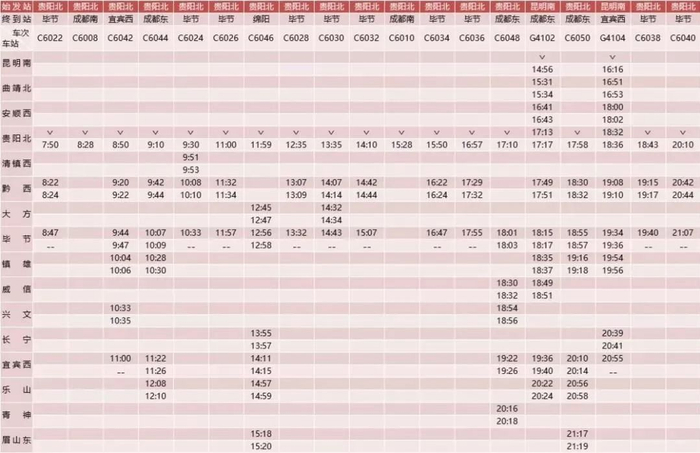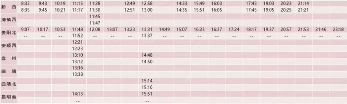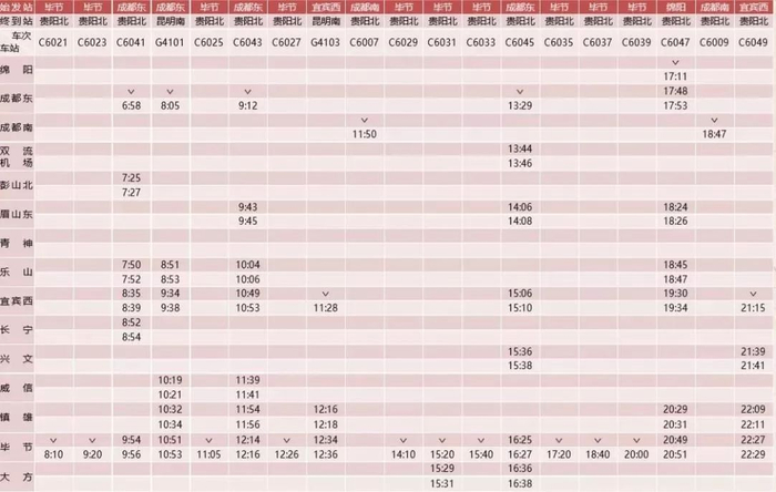 12月13日晚,成贵高铁末通段——宜宾至贵阳共9个新建车站(其中贵州5个)录入12306售票系统12月16日及以后日期中,贵阳北至这9个车站以及宜宾、成都东等城市均有“C”字头车次显示。