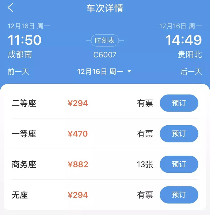 车票价格12月16日最快列车C6007次,二等座票价294元,一等座票价470元,商务座票价882元。