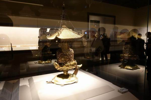 观众在展览现场细观供奉鉴真大师带到日本的舍利的“金龟舍利塔”