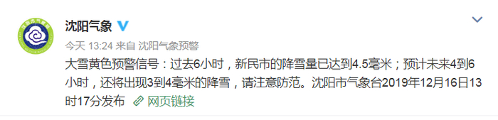 沈阳气象台发布了大雪黄色预警
