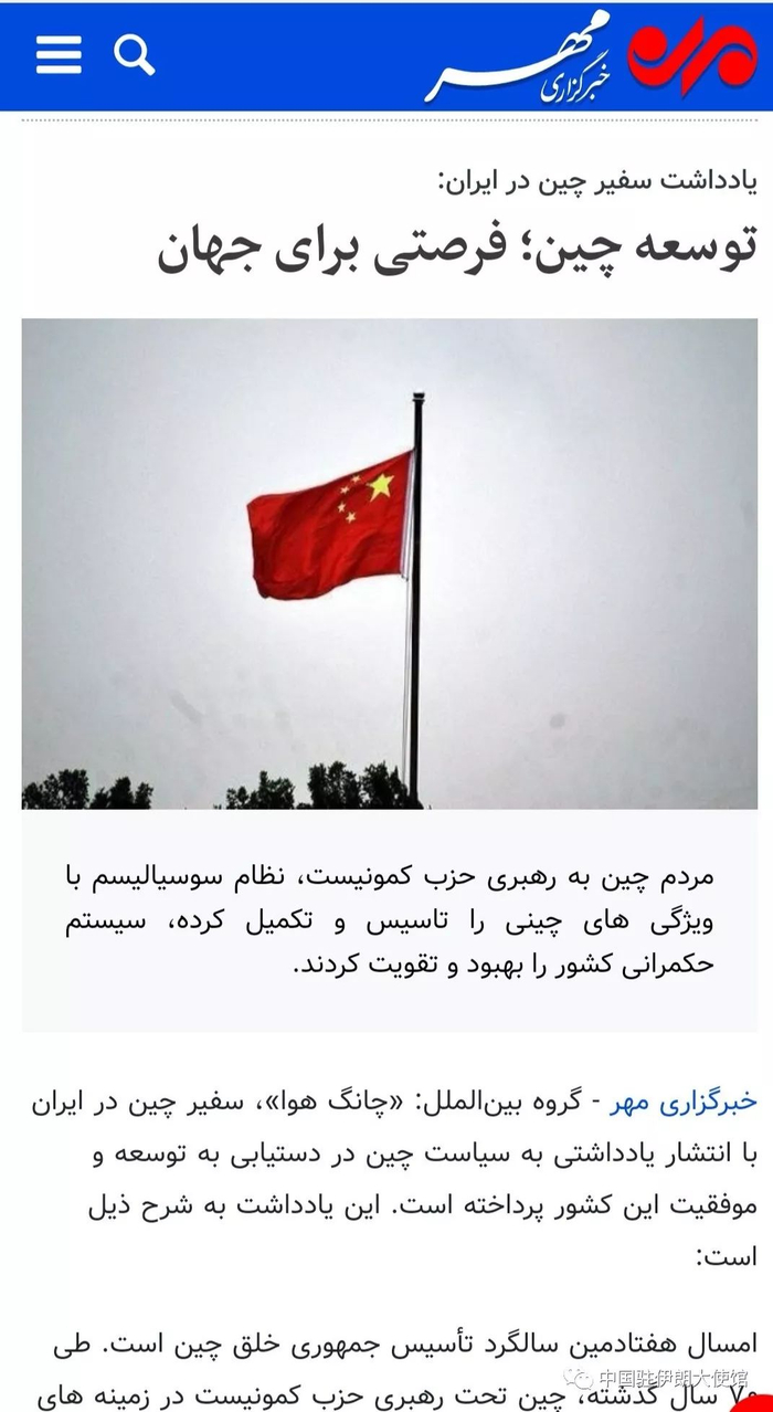 【新闻速递】驻伊朗大使常华在伊朗迈赫尔通讯社发表署名文章 《中国之治即世界之幸》