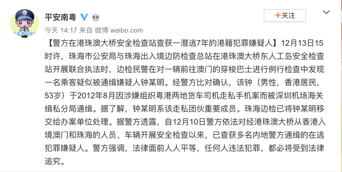 广东省公安厅官方微博“平安南粤”发布消息称,12月13日15时许,珠海市公安局与珠海出入境边防检查总站在港珠澳大桥东人工岛安全检查站开展联合执法时,边检民警在对一辆前往澳门的穿梭巴士进行例行检查中发现一名乘客疑似被通缉嫌疑人钟某明。这名53岁的钟姓男子,即是报称“失联”的香港男子。