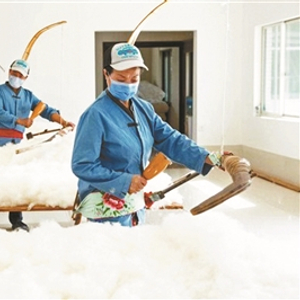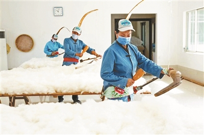 黄翠萍介绍,其中敲弹工艺是整个手工棉被的灵魂,也是“弹棉花”的“弹”字所在。利用弹弦的震动使棉花纤维打开,形成丰富的蓄热空间。再将整床棉花作为整体进行细致的敲弹。使得手工棉被有着独特的蓬松性和柔软性。“整个过程要敲弹7000多下,背面会被3000多根牵纱的纱线固定,最终经过打磨和缝制,历经3个小时才能完成一条被子的制作。”