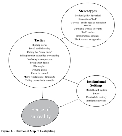 斯威特共进行了18个月的田野调查,研究方法包括对女性主义行动主义(feminist activism)的档案研究,对家庭暴力研究专家的深度访谈和参与式观察,以及对家庭暴力幸存者的生命故事访谈。她绘制了“煤气灯操纵法”微观策略的情景图,从中可以看到施害者使用的种种策略——不断反转的故事、社交网络入侵、叫她“疯婊子”、声称权威机构在看着她、可以令她混淆、在细节处撒谎、指责、否认事件、经济控制、对女性气质的微观规制、告诉他人她情绪不稳定——都源于与性别、种族等相关的刻板印象(非理性、愚蠢、歇斯底里、性方面“不端”、“粗心大意”需要男性管制、对事件的观察不可靠、“坏”母亲,无知的移民,具有攻击性的黑人女性),以及会对受害者产生极大影响的制度性背景(心理健康体系、警察、法院/儿童监护、移民体系),并最终导致了“超现实感”的产生。