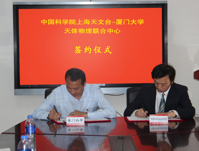 近日,我校与中国科学院上海天文台签署新一轮的“中国科学院上海天文台-厦门大学天文学系天体物理联合中心”(以下简称上厦中心)合作协议。厦门大学党委副书记赖虹凯、上海天文台台长沈志强、上海天文台人教处处长于申、物理科学与技术学院院长方陶陶、副院长顾为民、上厦中心主任王俊峰、天文学系副主任刘彤、天文系各位老师及学院办公室主任参加了签约仪式。仪式由天文系副主任刘彤教授主持。