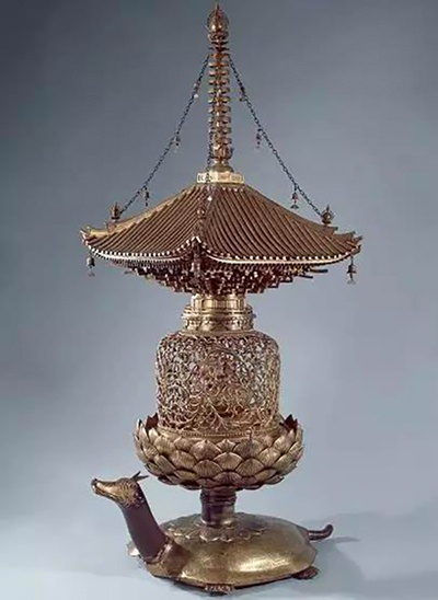在镰仓时代铸造了一座金铜的龟舍利塔,用于盛放舍利壶。这件器物造型别致,昂首小金龟为底座,上承莲花宝座,之上是塔身和塔檐,塔身镂空雕刻,曼陀罗花饰环绕塔身。据传,鉴真东渡时在海上遇到风浪,舍利壶跌入海中,龙神化做龟,守护舍利并交还。此塔亦有敬拜龙神之意。